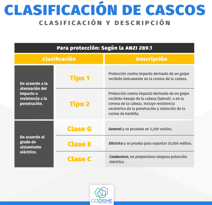 Clase E (Dieléctrico): Los cascos Clase E deberán reducir la fuerza de impacto de objetos en caída y el peligro de contacto con conductores energizados a alta tensión eléctrica de hasta 20 000 V (fase a tierra).